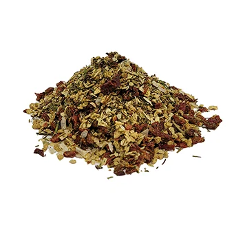COMPOSIÇÃO Cebola granulada, alho granulado, pimentão vermelho em flocos, tomate em flocos, orégano, salsa desidratada, manjericão, tomilho e aroma de fumaça.