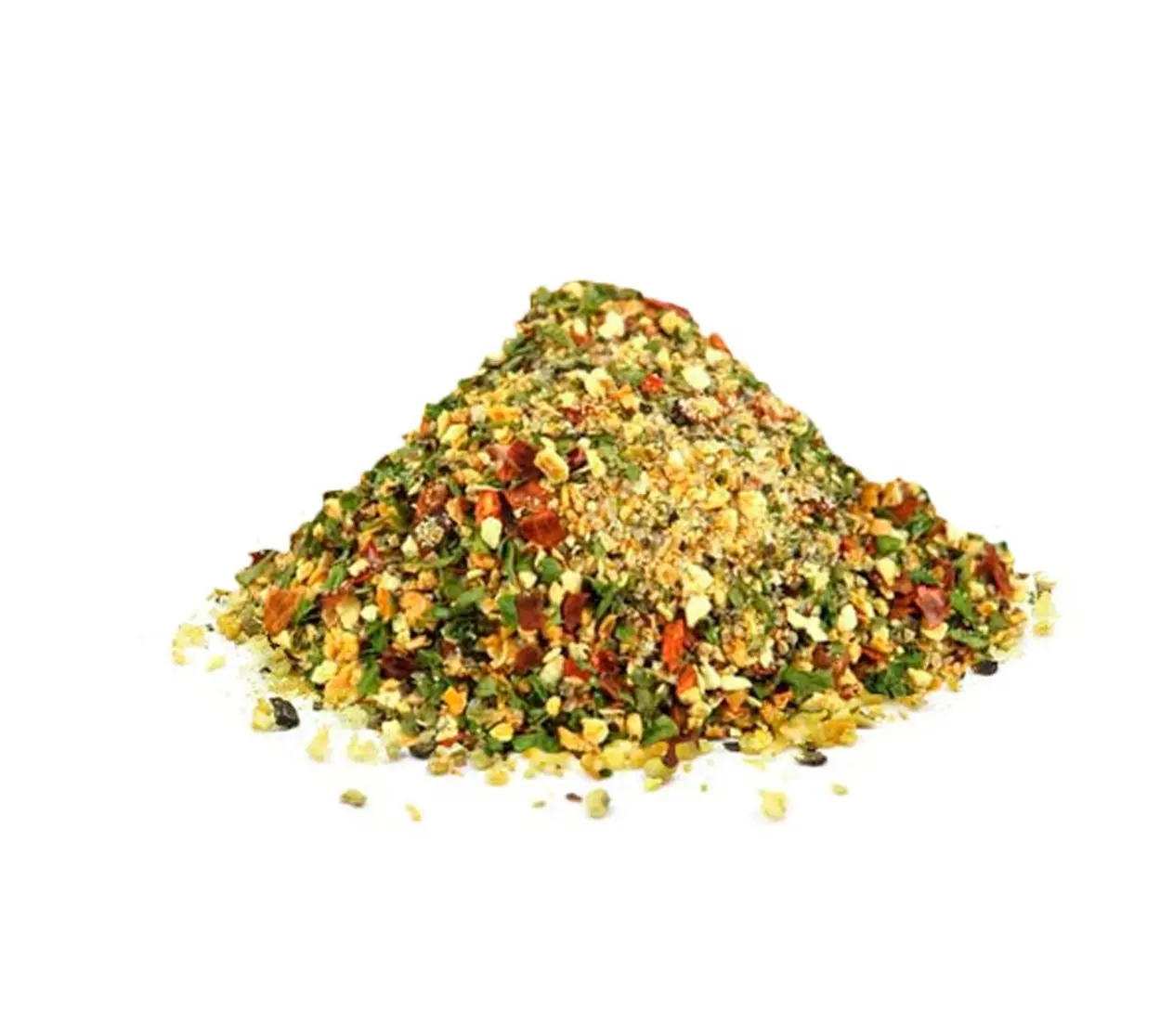 O chimichurri sem pimenta éflocado,de coramarelo-vermelho.Ideal para todos os tipos de carne branca evermelha, saladas e molhos a base de azeites.